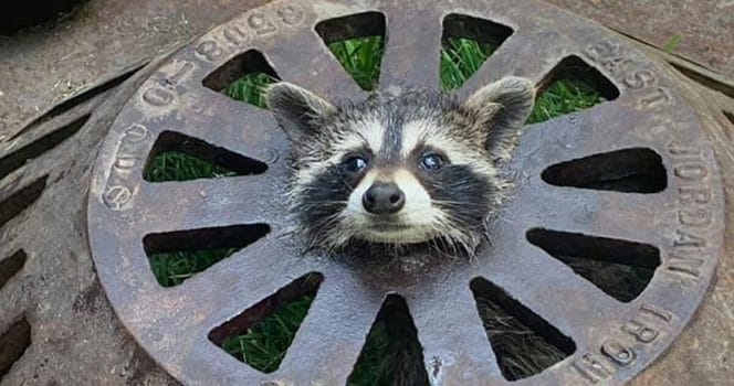 En tvättbjörn hade fastnat i en brunn i gatan – och satt fast med huvudet ovanför. Så här såg det ut.
