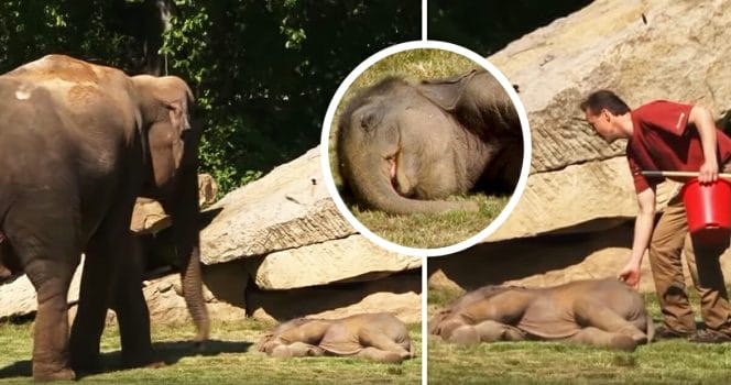 Den här elefantmamman lyckades inte väcka sin lille gosse. Då slog den moderliga instinkten in direkt. Hon försöker och försöker, men den lille parveln rör inte en min i solen.